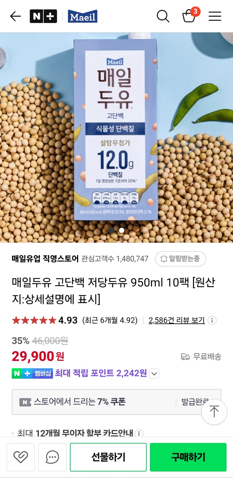 안녕하세요 대신리뷰입니다:) 오늘의 후기: 매일두유 고단백 저당두유 플레인(모든 후기는 내돈내산입니다) 이름: 매일두유 고단백 저당두유구매처: 네이버쇼핑 구매계기: 1단백질 보충 헬스를 하는데단백질 섭취가 필요하다 판단파우더는 얼굴에 뭐 날까봐 무섭고임상실험 하는 느낌이랄까 닭가슴살은 냉동실이 작아10개?정도 사면냉동실이 차버리는 문제가 발생 매끼 고기를 먹기에는지갑이 얇아질 것이고고민 끝에고단백 드링크를 마시기로 그중에서 매일두유 고단백을택한 이유는단백질 양도 적당하고맛있다고 해서... 디테일컷 950ml이니일반두유 190ml5개 합친 거라고생각하시면 된다 사진을 찍으면서 잘 흔들어서 마시겠다고 다짐했다. 설탕은 무첨가지만 당류가1.3g들었다. 먹어보니 맛이 괜찮았다.역시 단맛이 있..